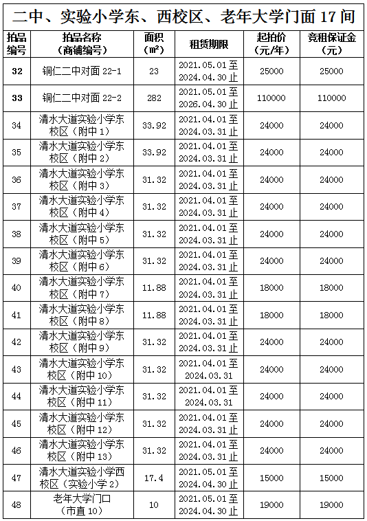 1.拍品32號標的位于銅仁二中對面,面積23㎡,租賃期3年(2021.05.01至2024.04.30);