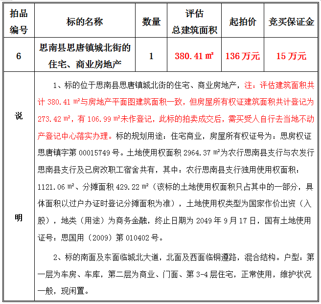 2、思南縣思唐鎮(zhèn)城北街的住宅、商業(yè)房地產(chǎn),建筑面積共:380.41㎡;起拍價(jià):136萬元;競(jìng)買保證金15萬元。