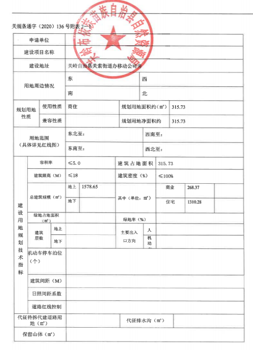 3、買受人須在簽訂出讓合同后,承諾一年內(nèi)開工建設(shè),三年內(nèi)必須竣工驗收。如不能按期開工、竣工,自違約之日起,每日須支付土地出讓價款的0.55‰的違約金。建設(shè)嚴(yán)格按照自然資源局出具的關(guān)規(guī)條通字(2020)136號《規(guī)劃設(shè)計條件通知書》中的規(guī)定和要求進行建設(shè):容積率≤5.0,建筑密度≤100%;地上總建筑面積:1578.65㎡,其中商業(yè)建筑面積:268.37㎡,住宅建筑面積:1310.28㎡;建筑限高≤18米。(詳見附件1)