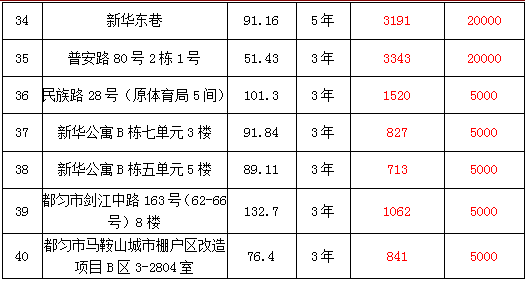 2、都勻市大十字三角巷、西苑小區(qū)、新汽車站對面、新華東巷、新華公寓、劍江中路、馬鞍山城市棚戶區(qū)、石惠公寓等10處房屋3年-5年租賃權(quán),面積約13.27㎡-221.94㎡;