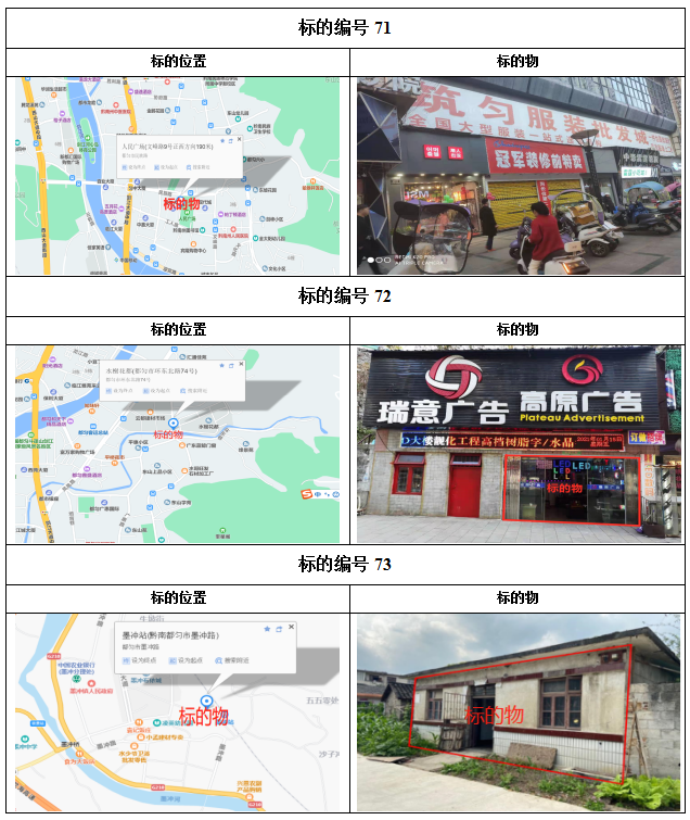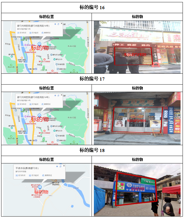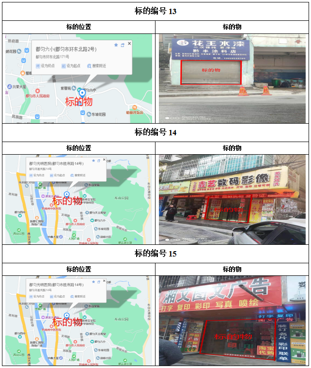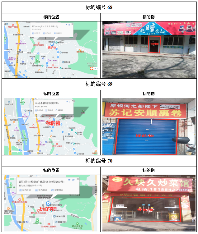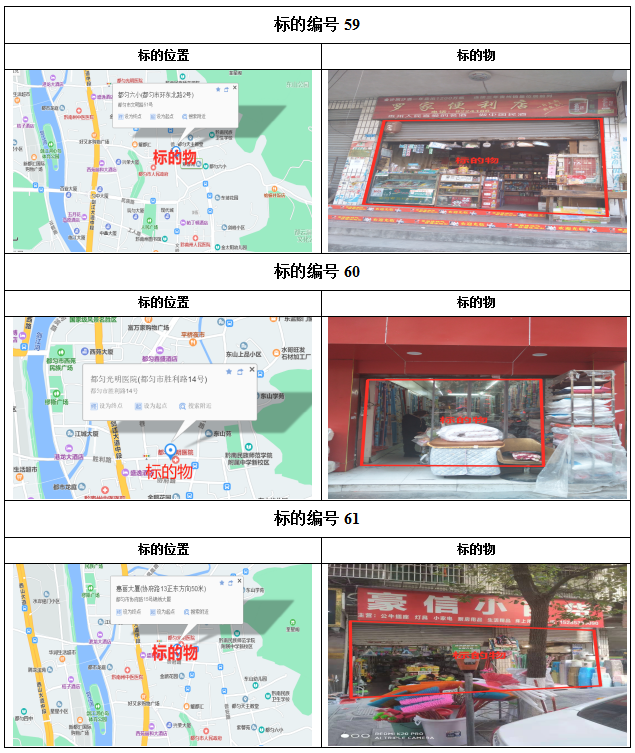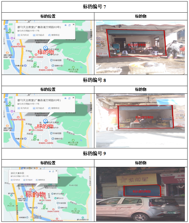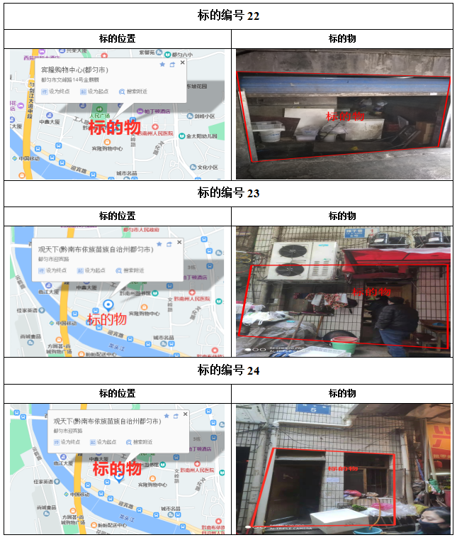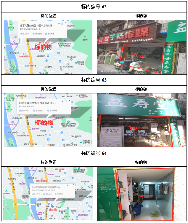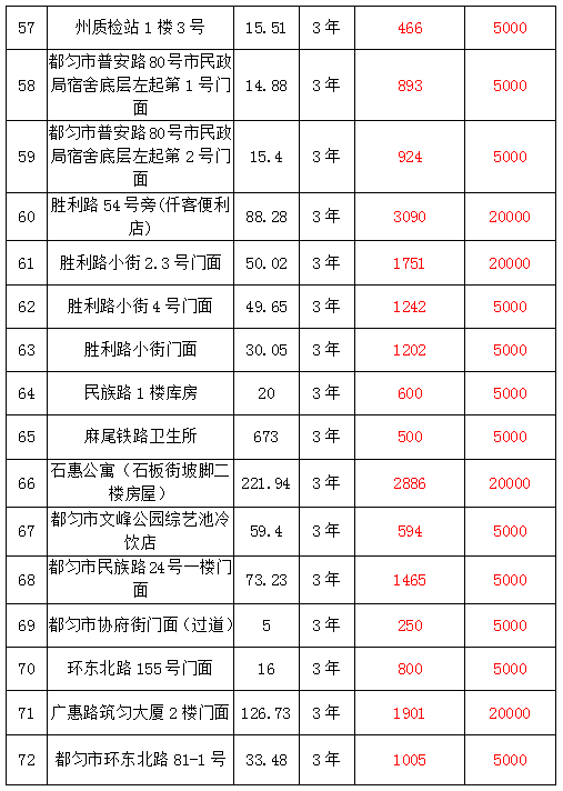 1、都勻市劍江中路、環(huán)東北路、文明路、民族路、勝利路、會云橋、育英巷等62處門面3年租賃權(quán),面積約5㎡-137.74㎡;