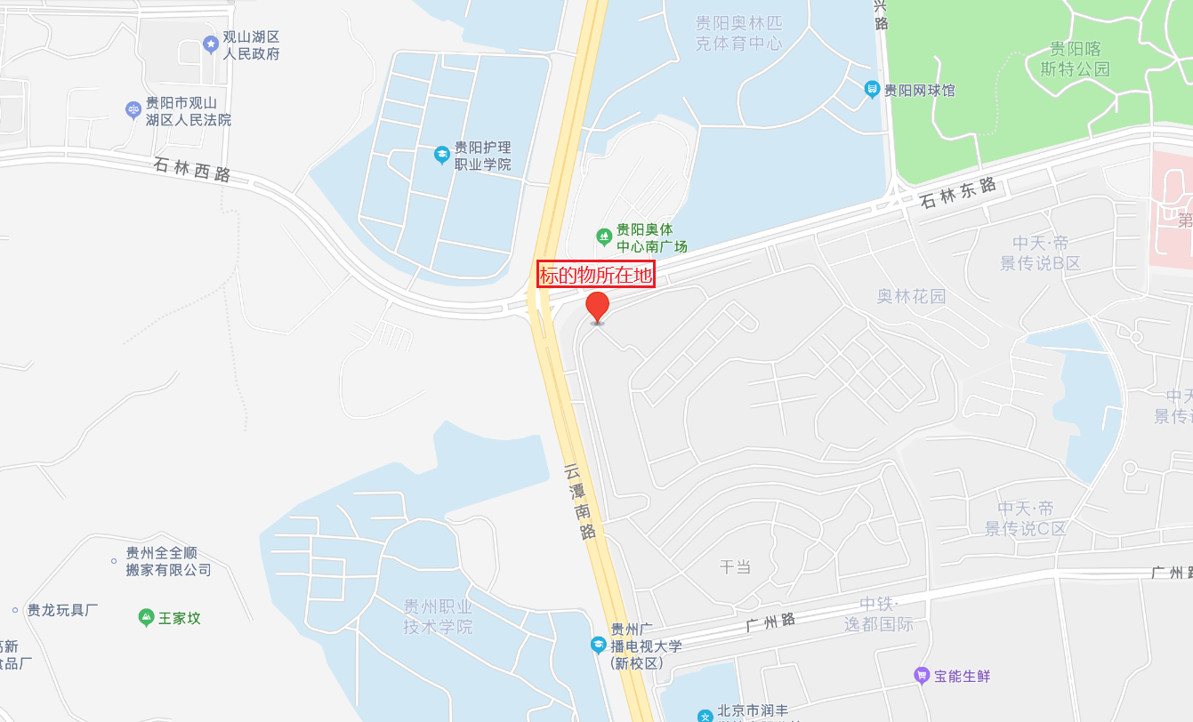 該標的周邊道路通達、停車便捷、基礎(chǔ)設(shè)施完備,達“五通一平”,室內(nèi)地面鋪地磚、墻面貼石材,頂棚為層板吊頂,采光、通風良好。所在區(qū)域有金陽醫(yī)院、觀山湖區(qū)人民政府、貴陽喀斯特公園、貴陽奧林匹克體育中心等,商業(yè)集聚度及繁華度較高。