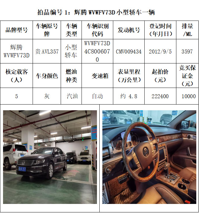 受委托,本公司定于2021年3月26日(星期五)下午14:30時(shí),在貴陽市中華南路20號新大陸數(shù)碼廣場10樓D座拍賣廳公開拍賣以下車輛:普拉多越野車1輛、超級維特拉越野車1輛、別克商務(wù)旅行車1輛、輝騰轎車1輛、途勝越野車1輛、雅閣轎車2輛、奧迪轎車1輛,長城牌小型越野客車1輛,共計(jì)9輛車。