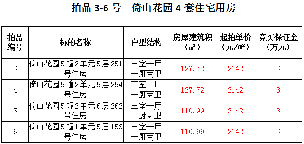 3、倚山花園4套住宅房產(chǎn),建筑面積:110.99—127.72㎡,起拍價(jià):2142元/㎡。