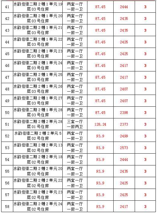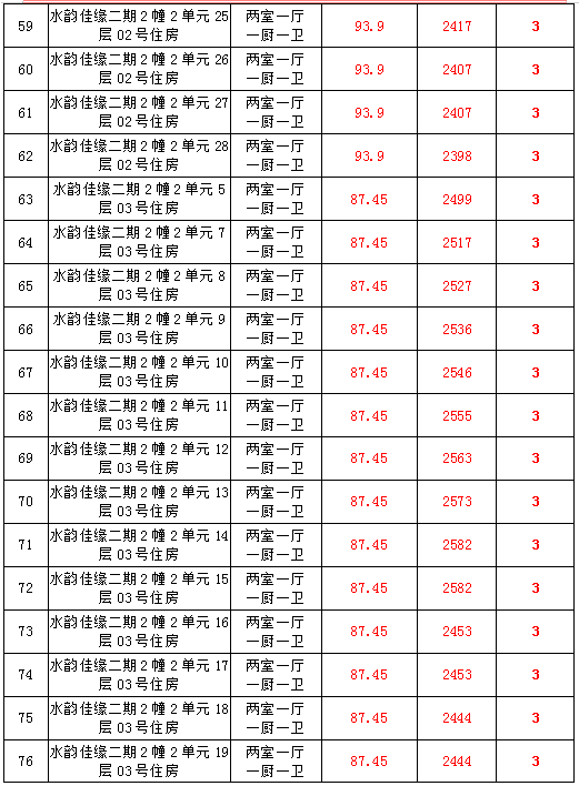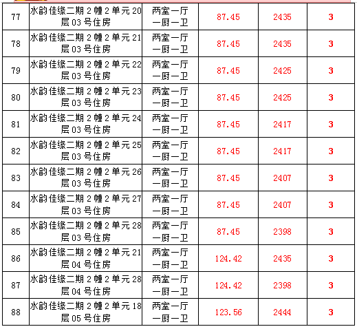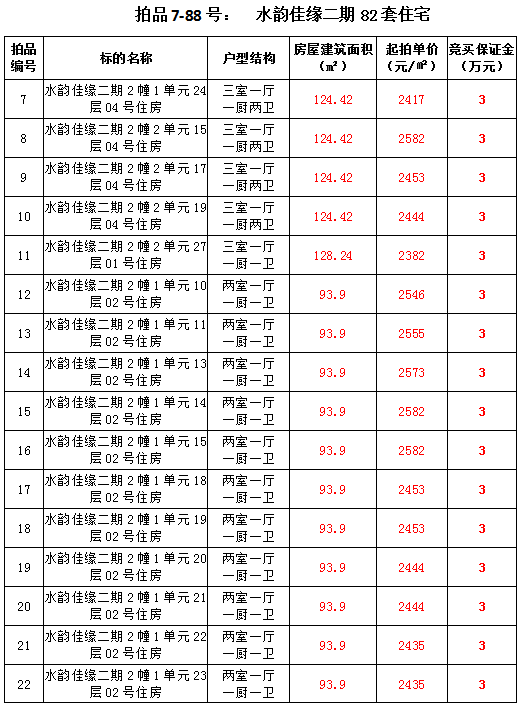 2、水韻佳緣82套住宅房產(chǎn),建筑面積:87.45—128.24㎡,起拍價(jià):2373—2582元/㎡;