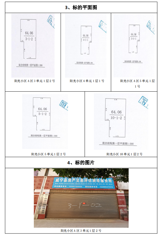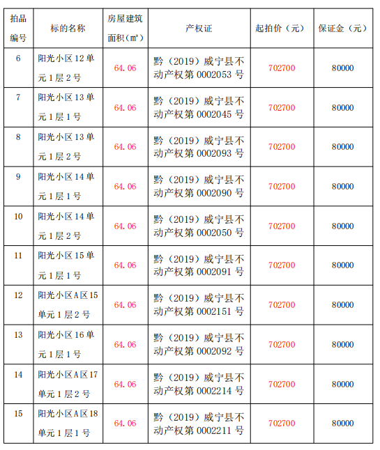 拍品編號6-15號標的位于威寧縣海邊街道廣園路陽光小區(qū),房屋結構均為:混合結構,權利性質:國有土地/出讓/其他,用途:商服用地/商業(yè)服務,使用期限:2012年12月20號至2052年12月19日。