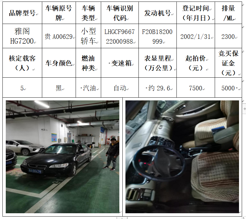 拍品編號2:雅閣HG7200小型轎車一輛
