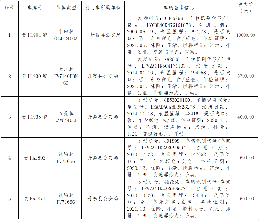 受委托,本公司于2021年9月28日(星期二)下午14∶30時(shí),在丹寨縣公安局六樓會(huì)議室,對(duì)以下標(biāo)的物按現(xiàn)狀現(xiàn)樣進(jìn)行公開拍賣。