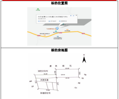 該標(biāo)的位于余慶縣大烏江鎮(zhèn)箐口中街,證載土地面積:約524.9㎡,證載獨(dú)用面積:437.22平方米,土地使用權(quán)性質(zhì):劃拔,土地證載用途:煙葉倉(cāng)儲(chǔ),土地證號(hào):余國(guó)用(2008)第582。