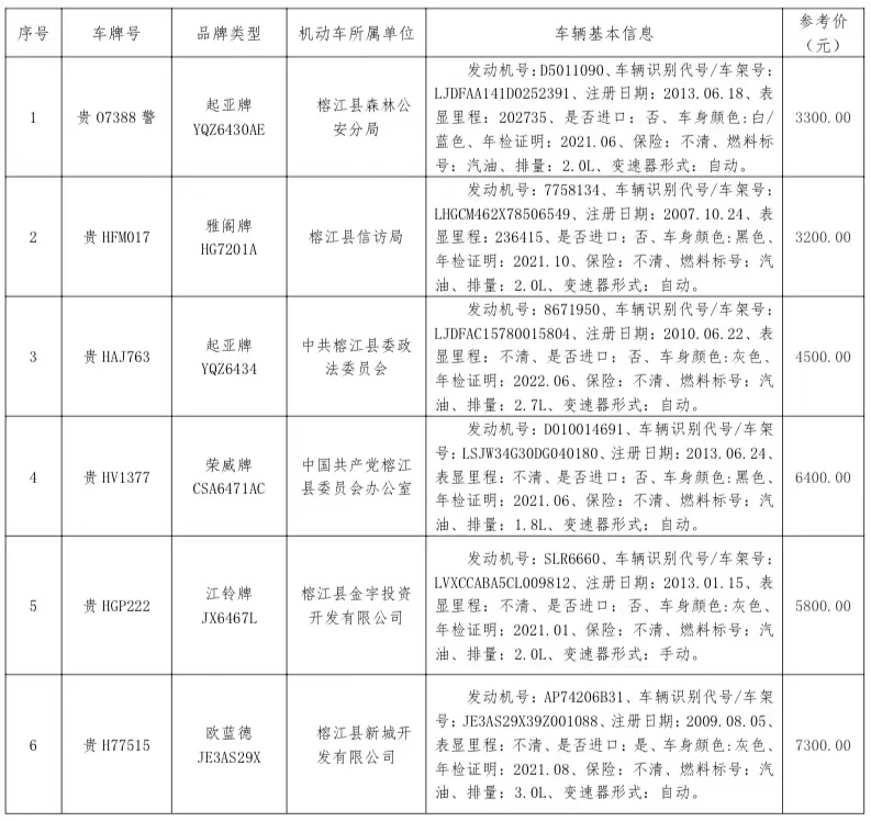 受委托,本公司于2021年10月27日(星期三)下午14∶30時(shí),在榕江縣財(cái)政局會(huì)議室,對以下標(biāo)的物按現(xiàn)狀現(xiàn)樣進(jìn)行公開拍賣。