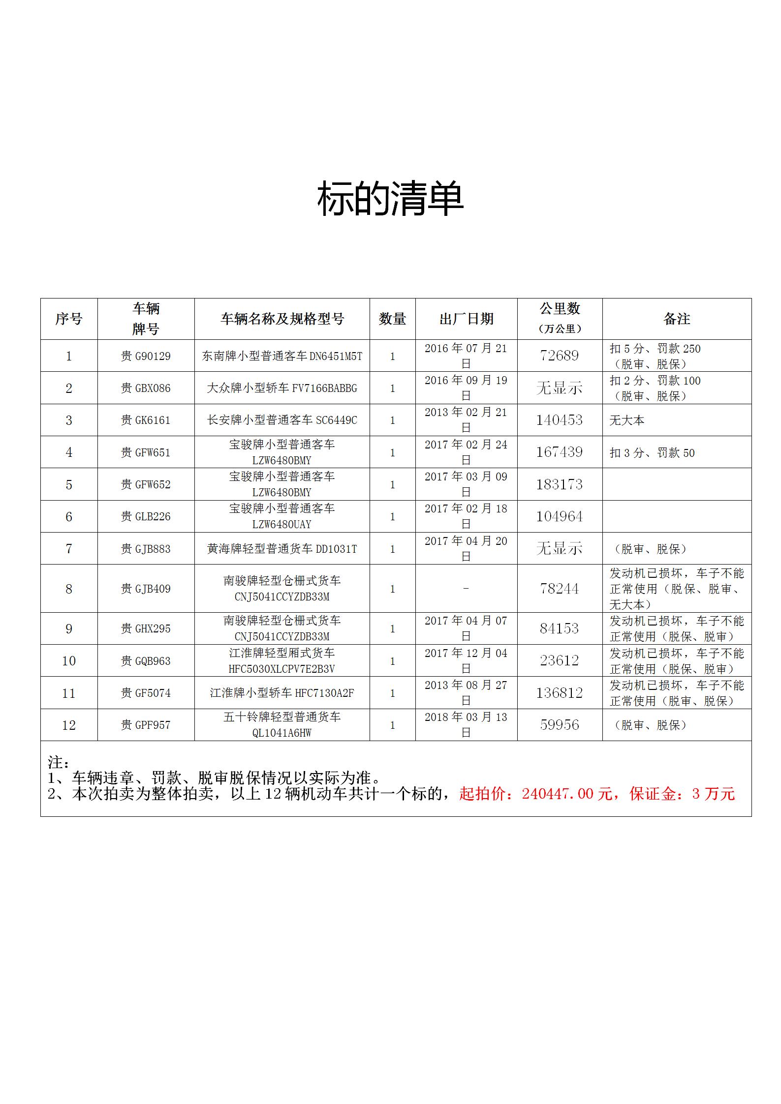 大眾牌、寶駿牌、東南牌、黃海牌、長(zhǎng)安牌、南俊牌等12輛公務(wù)用車(chē)整體打包拍賣(mài)