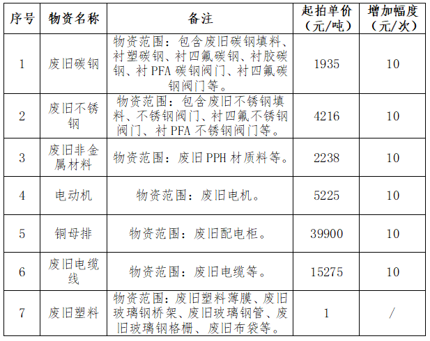該標的為整體拍賣,以序號1(廢舊碳鋼)起拍單價1935元/噸進行競價,采取增價方式競拍,每次每噸加價10元,上不封頂;序號1(廢舊碳鋼)每增加10元/噸,序號2-6廢舊物資同步增加10元/噸。序號7(廢舊塑料)以起拍價隨附買受,結算數(shù)量以交付時實際過磅數(shù)量為準。